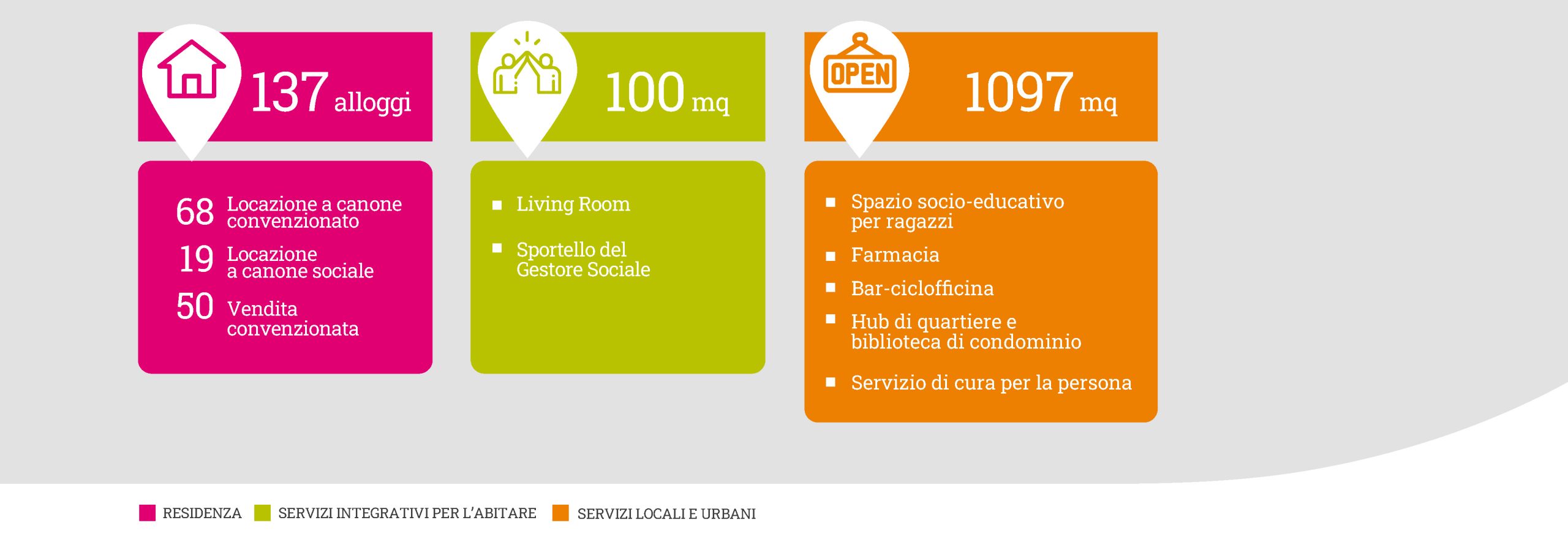 Il nuovo progetto URBANA New Living offre 137 appartamenti, di cui 68 in locazione convenzionata, 19 a canone sociale e 50 in vendita di dimensioni e tipologie differenti, quali bilocali, trilocali e quadrilocali. Gli spazi pubblici al piano terra vengono valorizzati attraverso servizi a carattere commerciale e servizi per l’abitare e per il quartiere, con l’obiettivo di favorire le relazioni e la coesione sociale del territorio. L’impianto edilizio di URBANA New Living è caratterizzato da edifici organizzati intorno ad una corte aperta al quartiere ma raccolta, dal carattere domestico. Al piano terra degli edifici si collocano gli spazi comuni: 79 mq sono destinati ai servizi integrativi per l’abitare e 1097 mq ai servizi locali e urbani disponibili al quartiere.