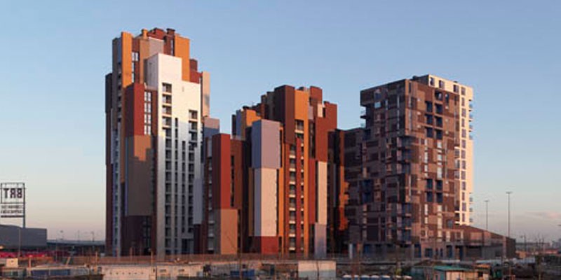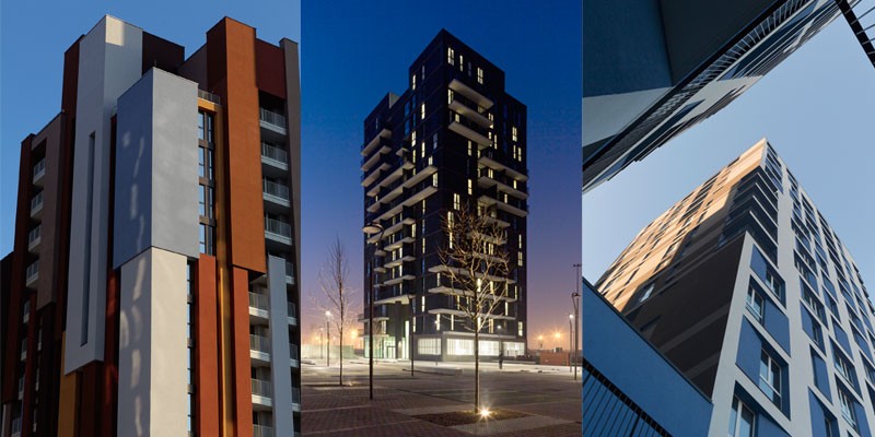 Number of dwellings: first stage of development (7 tower buildings): 93 affordable rent homes, 140 affordable rent homes with purchase option e 164 apartments for sale